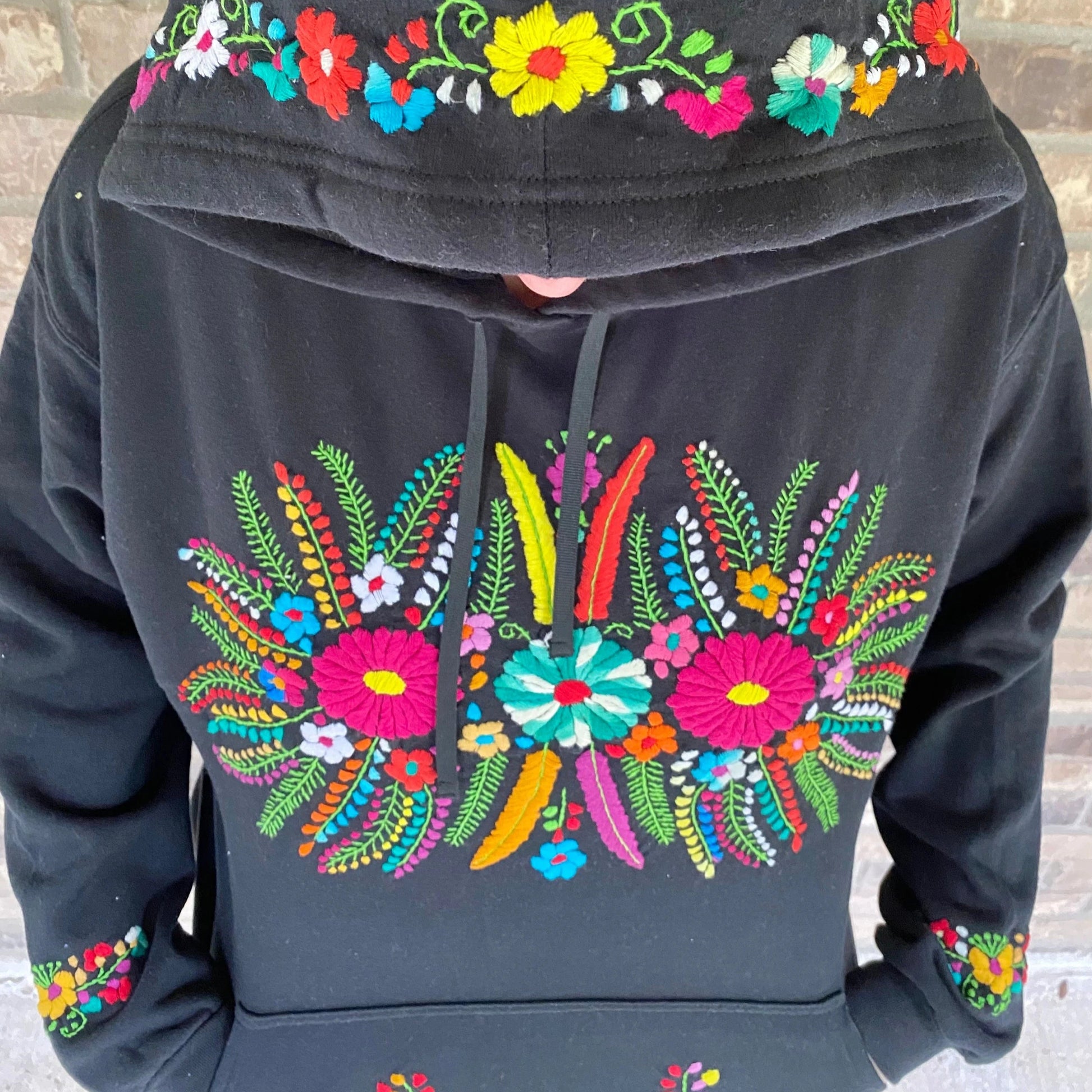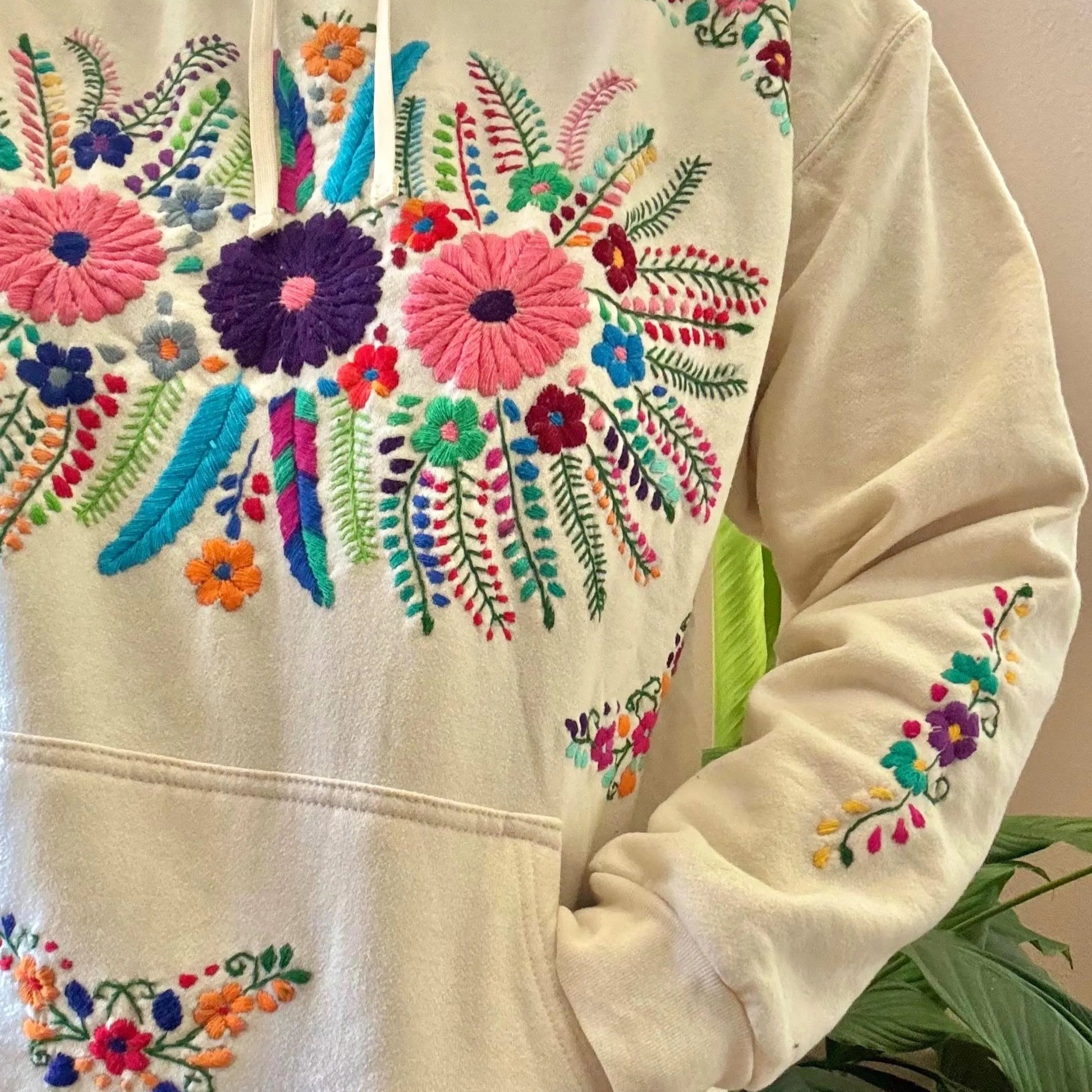 This sweatshirt is hand embroidered by Mexican Artisans and each can take up to a week for one person to finish!