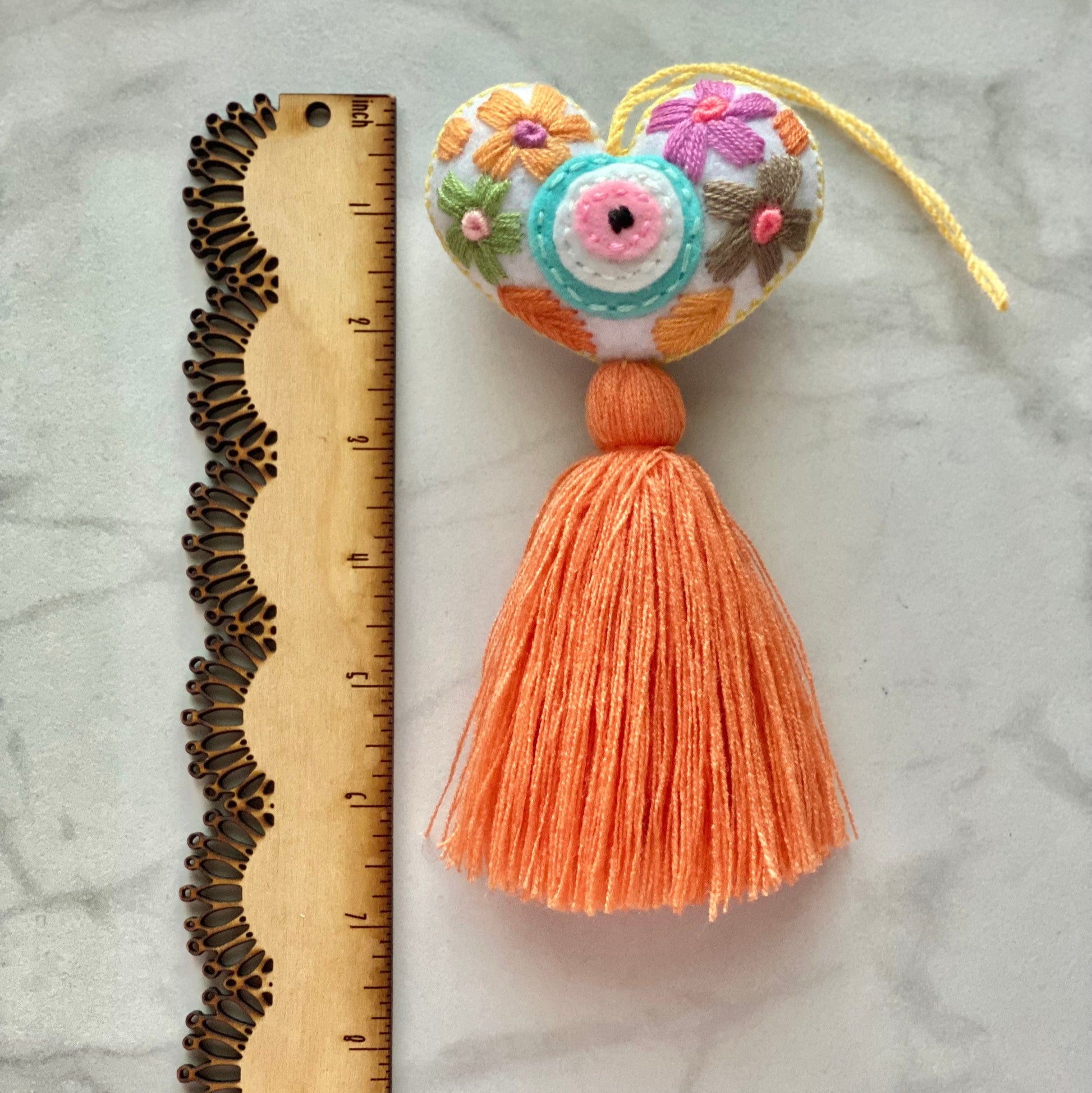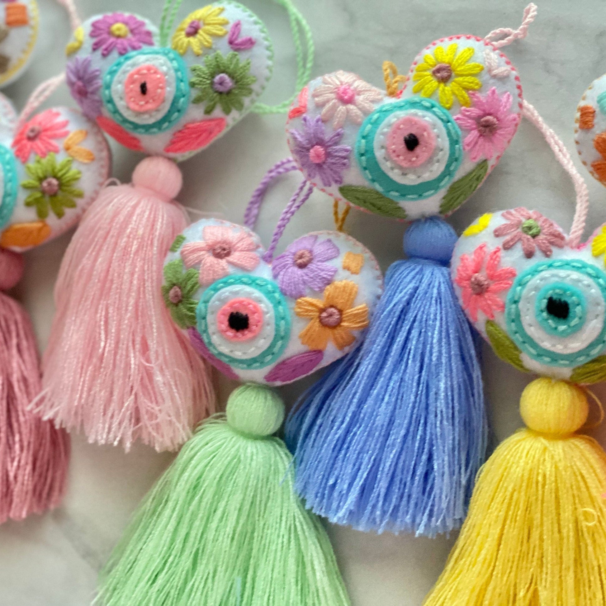 Embroidered pastel evil eye heart shaped tassel makes the perfect colorful and joyful accessory for your bag or rear view mirror!